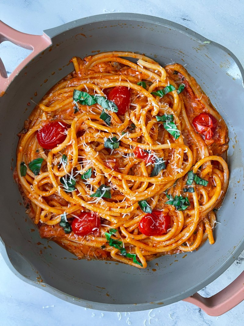 Introducing my husband’s “new favorite pasta dish” AKA my tomato mascarpone sauce with bucatini. This dish is SO good – it’s creamy but still has the base of tomato sauce that I absolutely love. Topped with basil – it might just be MY new favorite pasta dish. Recipe can be found below, enjoy! Ingredients 1/2…