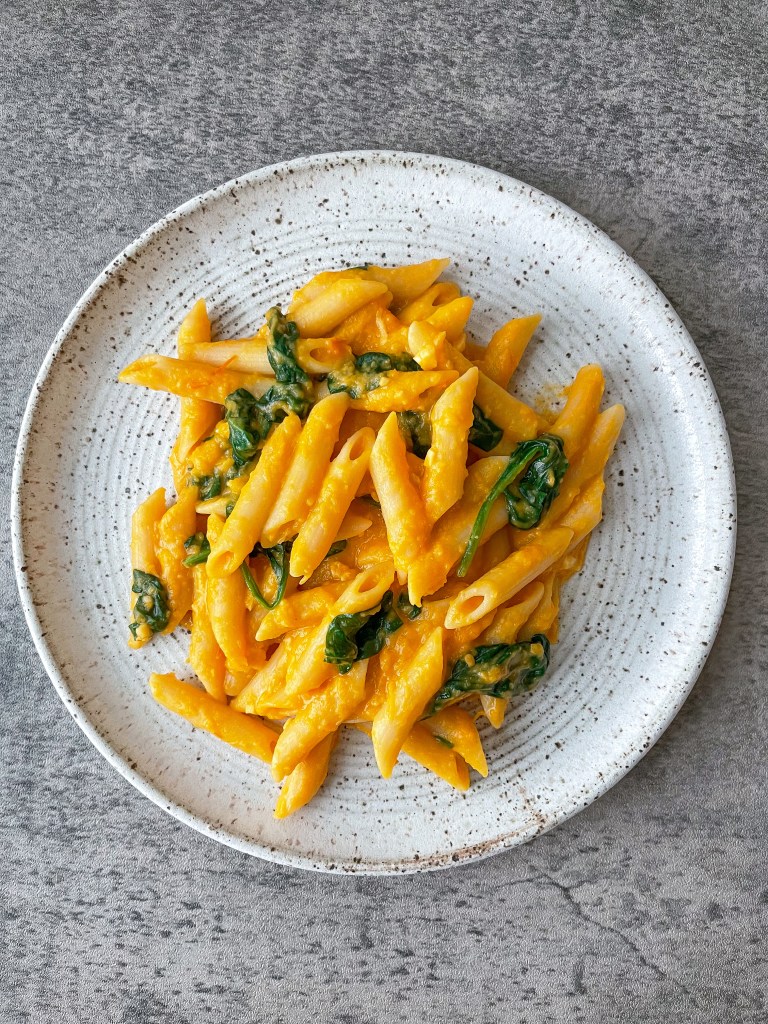 Heat a pan over medium heat and add EVOO & garlic. After 30 seconds, add spinach and saute in the garlic. Add butternut sauce directly to pan and let simmer.