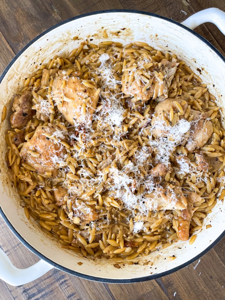 After 10-12 minutes, check the orzo and stir. Add more chicken broth if the orzo still isn’t done (mine wasn’t!) and cover again. Once orzo is cooked, add heavy cream and mix. Remove from heat, add parmesan & ENJOY!